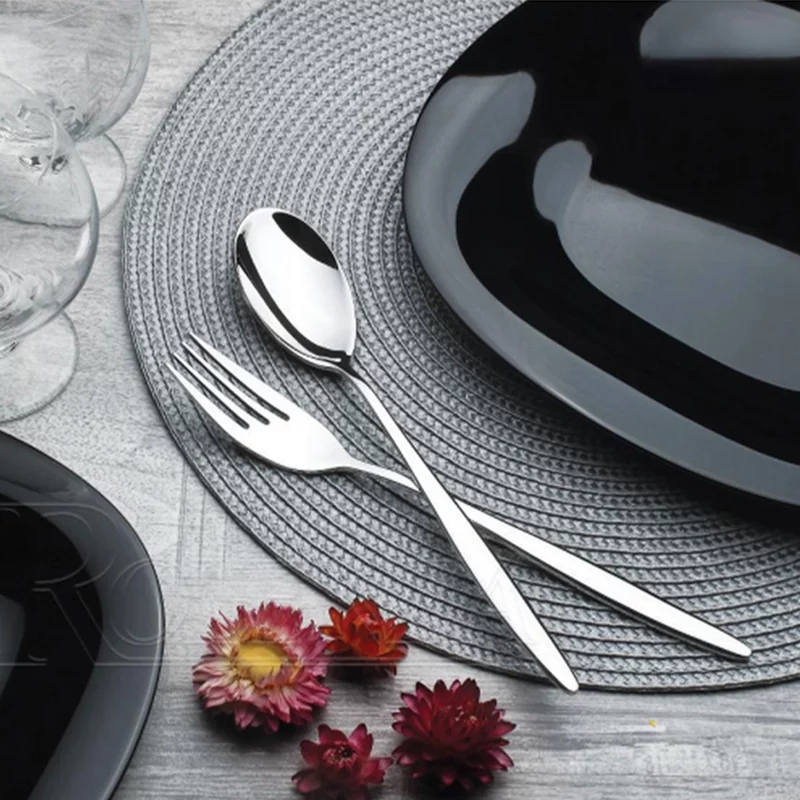 سرویس قاشق چنگال رومیزی رولنزا کد A42 از جنس استیل نگیر است.