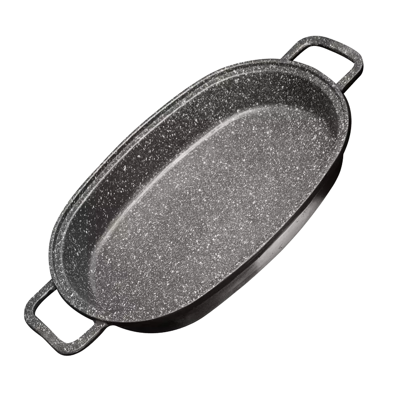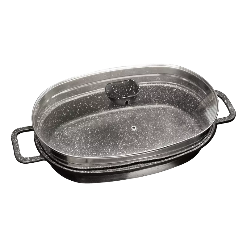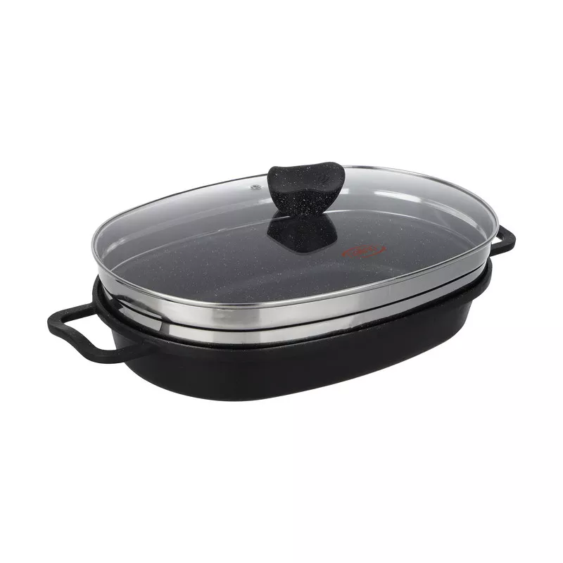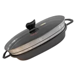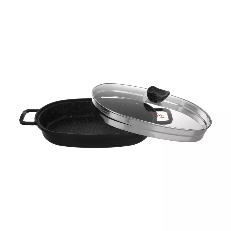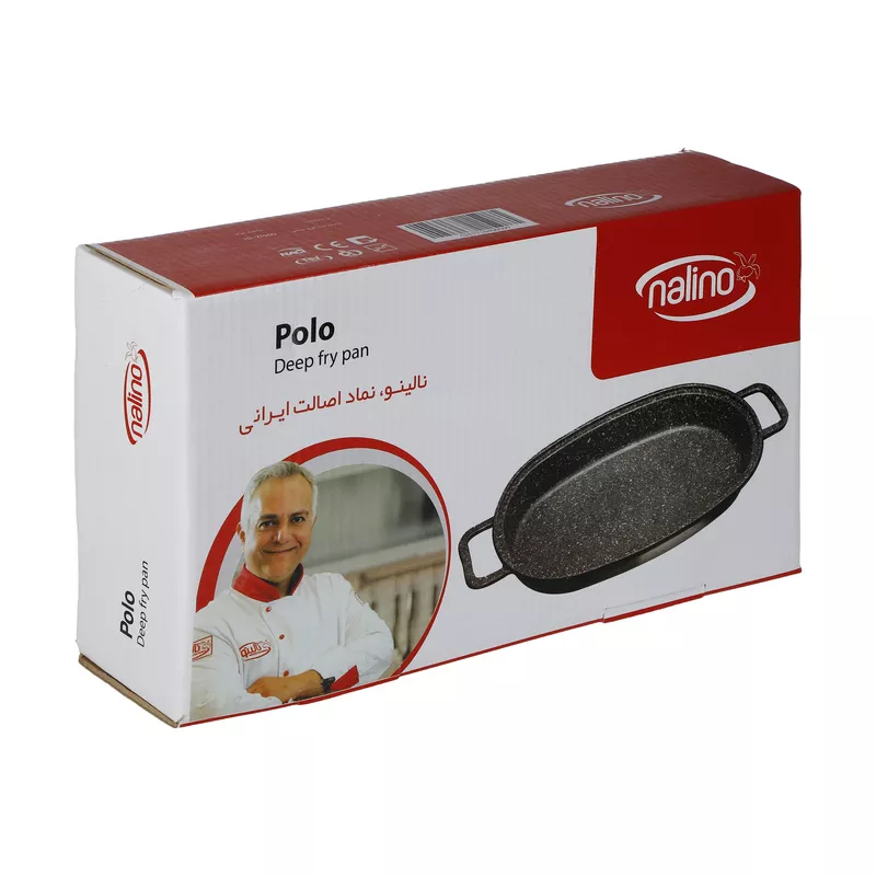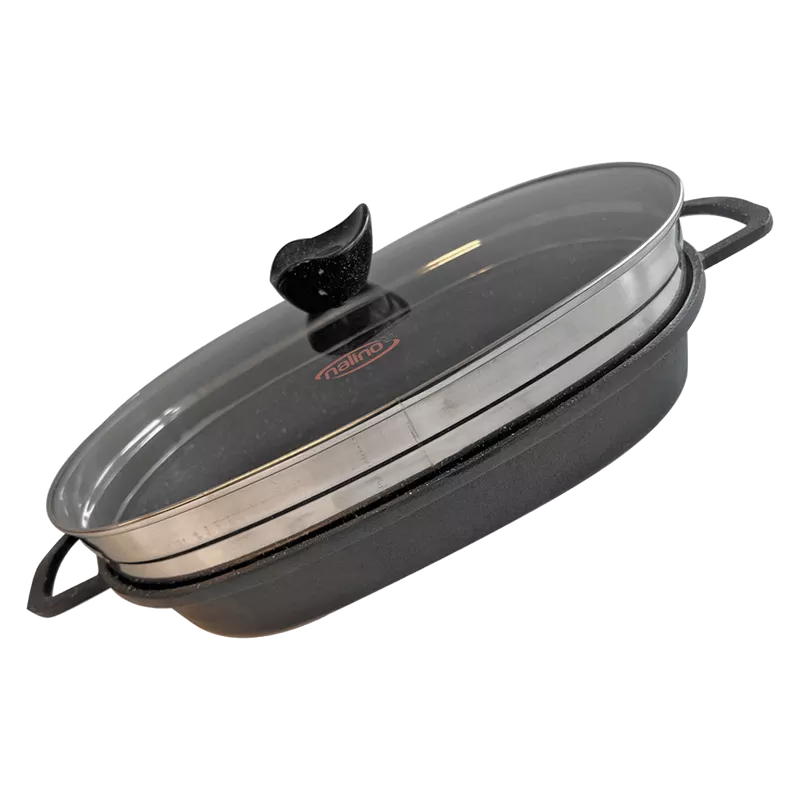 تابه چدنی نالینو مدل پولو Pollo، بیضی شکل بوده و دارای یک درب شیشه ای نیز می باشد.