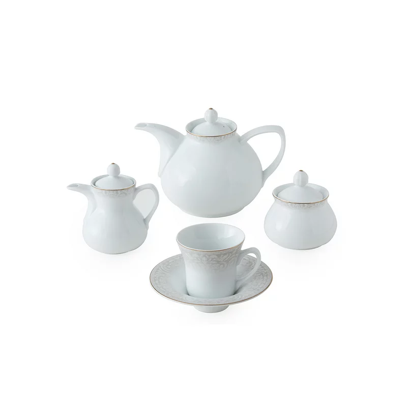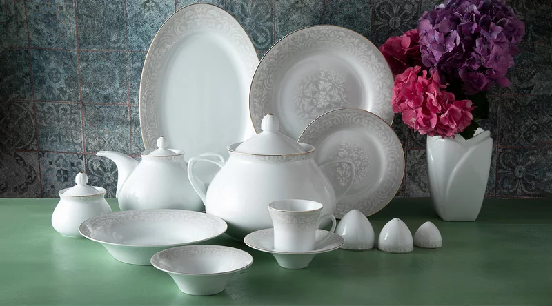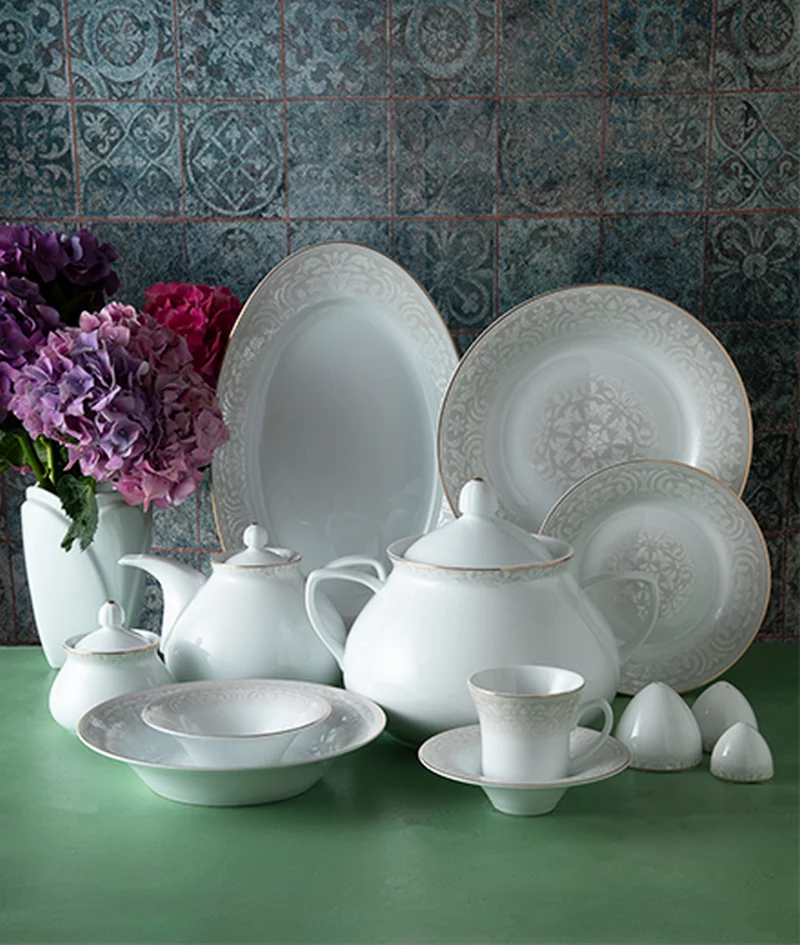 پلو 12 – خورش 12 – میوه 18 – پیاله 12 – سوپخوری 1 – فنجان 12 – نعلبکی 12 – قوری 1 – قندان 1 – شکرریز 2 – کاسه سالاد 2 – کاسه سرو 3 – آبگوشت 6 – دیس 3 – نمکدان 6 |