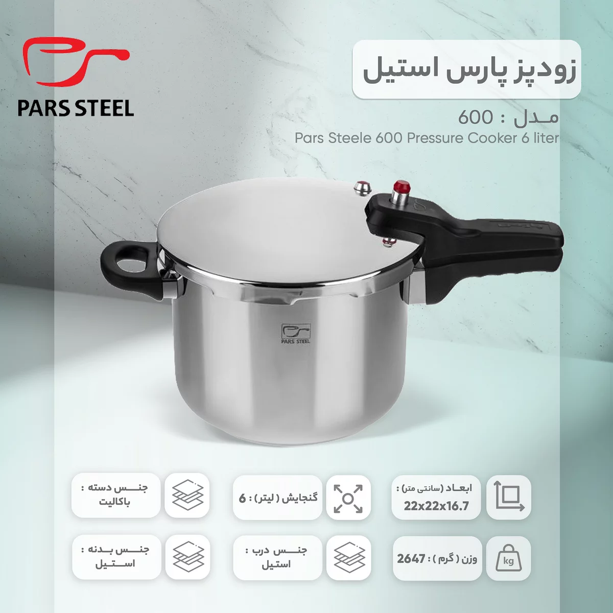 مشخصات فنی زودپز پارس استیل کف سه لایه (6 لیتر):