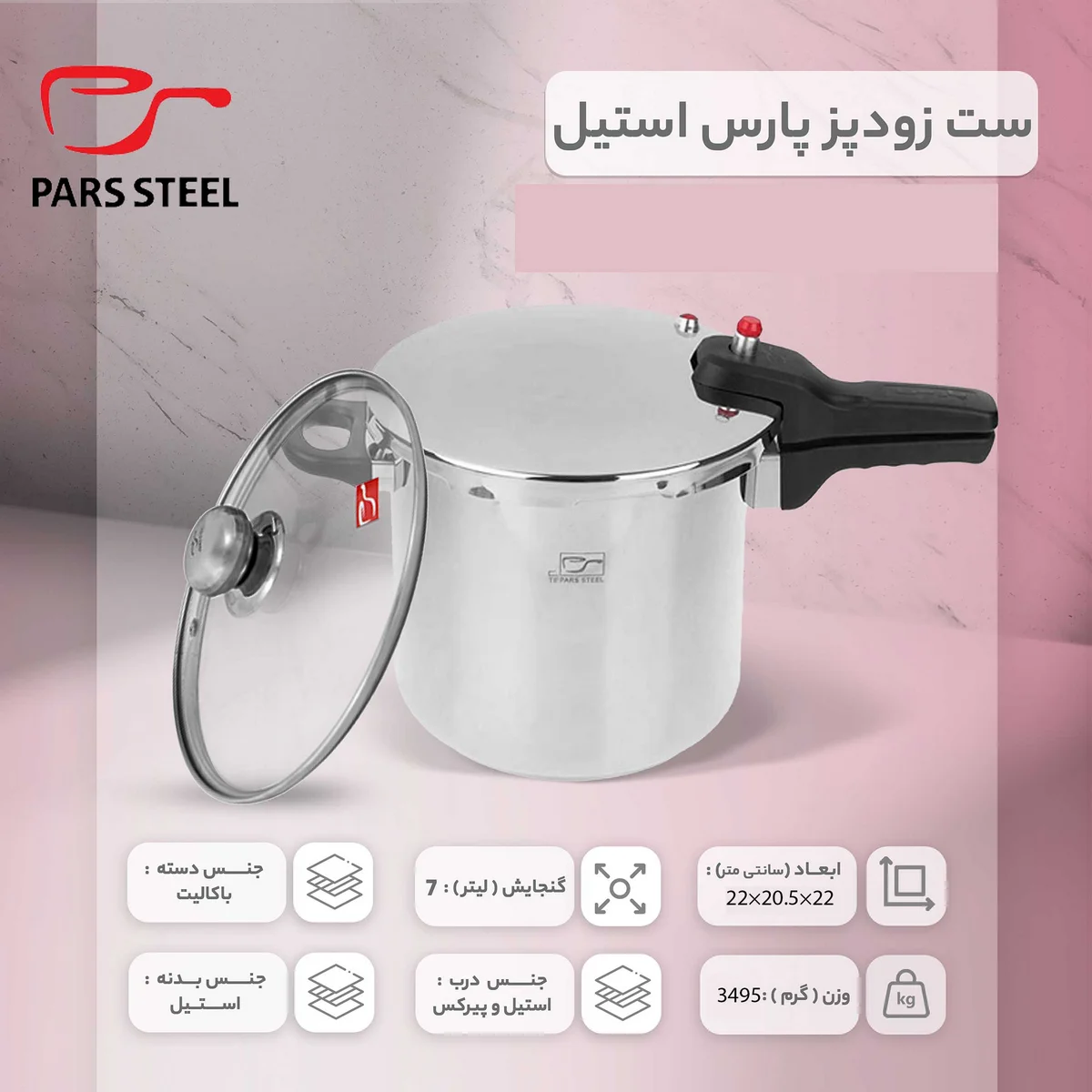 مشخصات فنی زودپز پارس استیل کف سه لایه (7 لیتر) با درب: