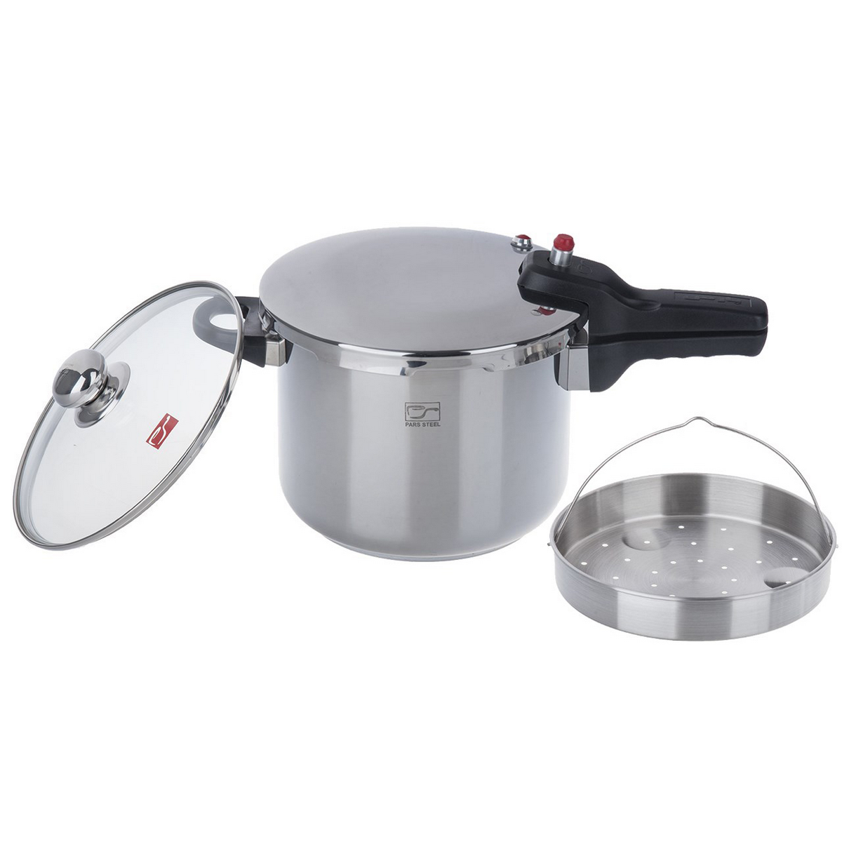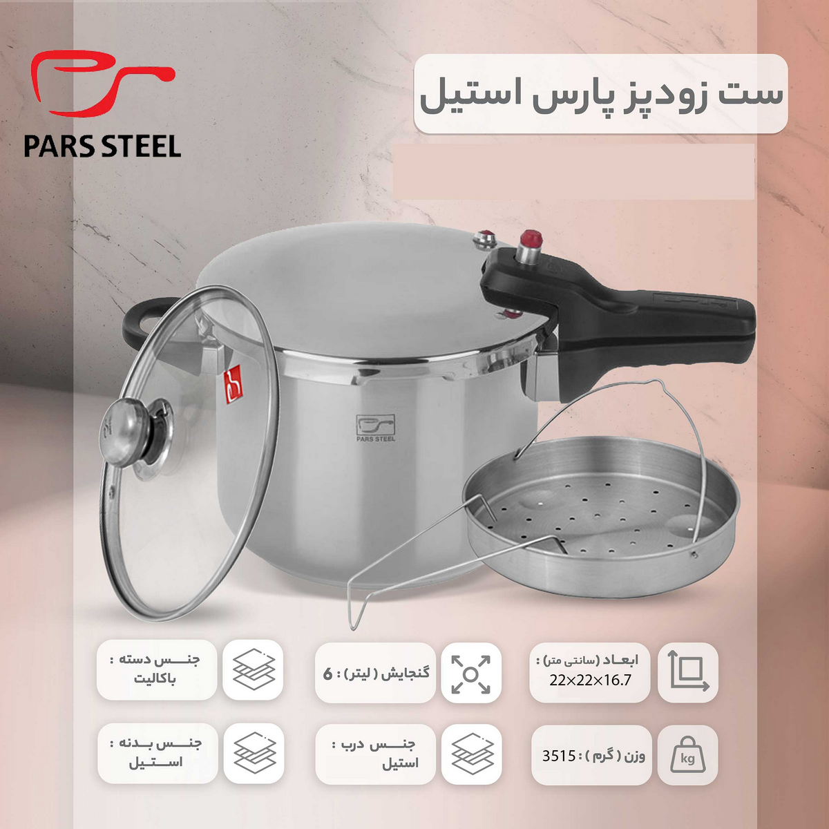 ترکیب زودپز پارس استیل کف سه لایه (6 لیتر) با درب و بخارپز: