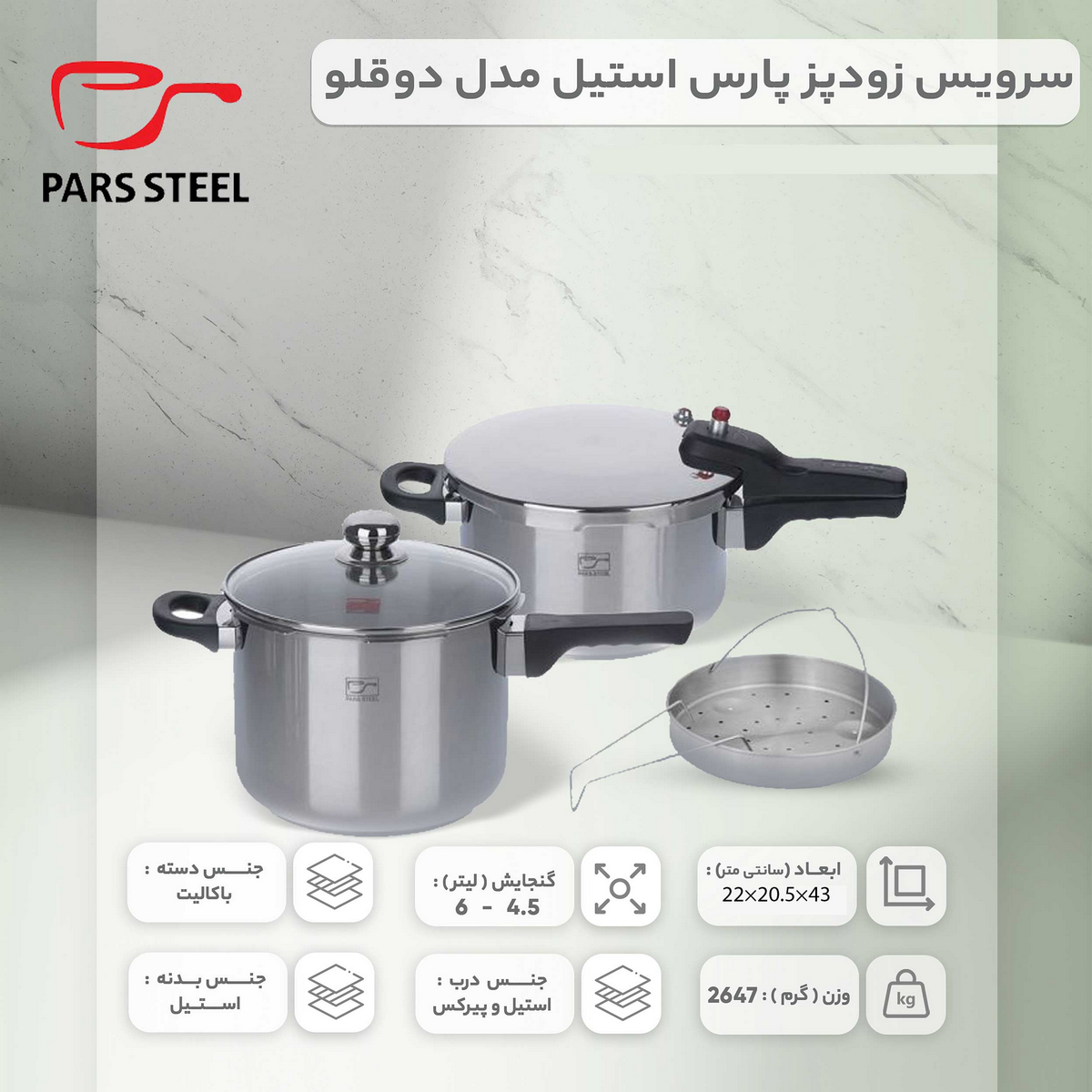 ترکیب زودپز دوقلو پارس استیل کف سه لایه (4.5 و 6 ليتر) با درب و بخارپز: