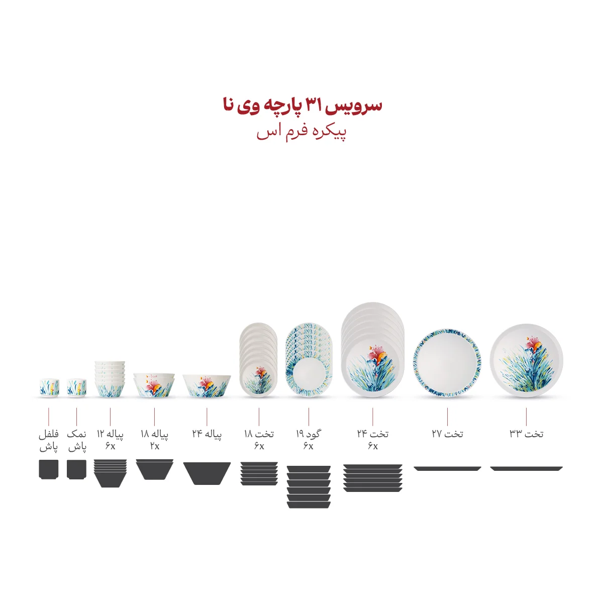 پلو 6 – خورش 6 – میوه 6 – دیس 2 – پیاله 6 – پیاله متوسط 2 – سالاد 1 – نمکپاش 1 – فلفلپاش 1